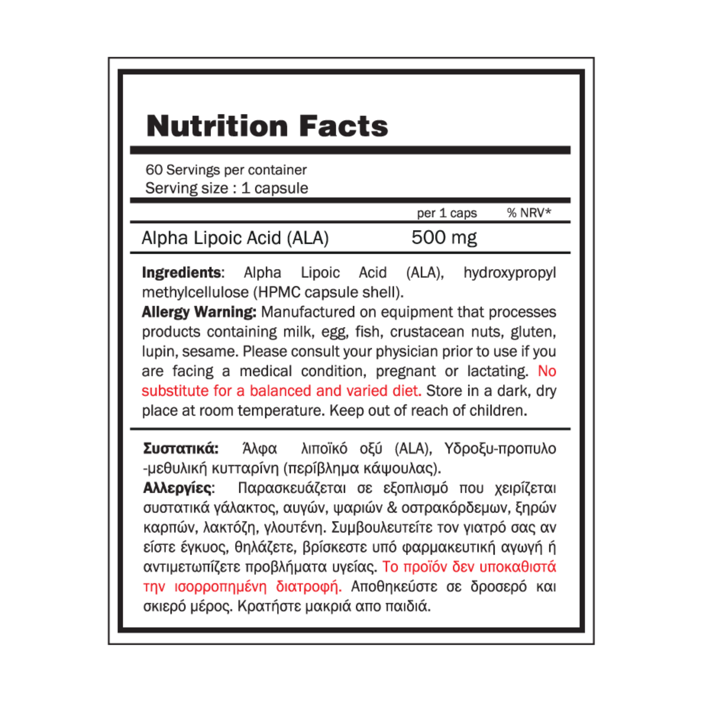 6. Σκοπός της Συμπλήρωσης: Το A.L.A. είναι γνωστό για την υποστήριξη της συνολικής ευεξίας, συμπεριλαμβανομένης της αντιοξειδωτικής δραστηριότητας, της προστασίας των κυττάρων και των πιθανών οφελών για υγιεινά επίπεδα σακχάρου στο αίμα.