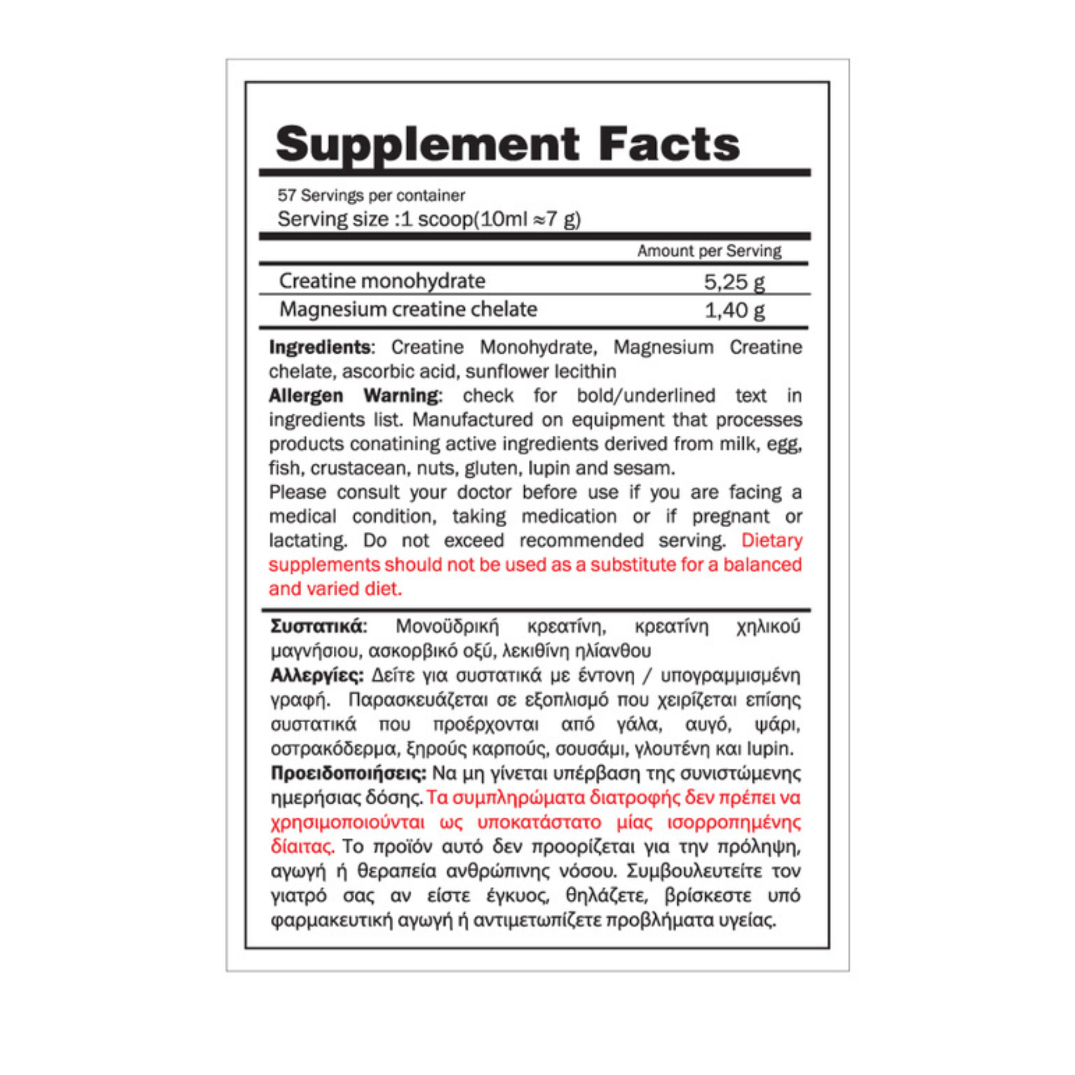 & κρεατίνη χηλικού μαγνήσιου η οποία είναι ένας συνδυασμός Μονοϋδρικής Κρεατίνης και Μαγνησίου σχεδιασμένος ώστε να αυξάνει τη σωματική απόδοση. Το μαγνήσιο συμβάλλει αποτελεσματικά στη φυσιολογική μυϊκή λειτουργία και στη φυσιολογική σύνθεση της πρωτεΐνης